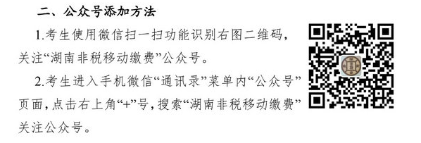 2.考生繳費(fèi)方式:“湖南非稅移動(dòng)繳費(fèi)”微信公眾號(hào)支付??忌蜷_(kāi)手機(jī)微信進(jìn)入“湖南非稅移動(dòng)繳費(fèi)”公眾號(hào)中繳費(fèi)頁(yè)面,輸入考生姓名+報(bào)名時(shí)的有效身份證件號(hào)碼信息,按手機(jī)端系統(tǒng)提示進(jìn)行繳費(fèi)。