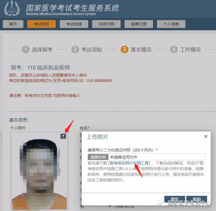 報名上傳照片前須通過“醫(yī)考報名照片檢測工具”(下載地址在上傳照片界面處提示,如下圖)進(jìn)行檢測處理。檢測過程請嚴(yán)格按頁面說明操作,檢測通過后保存,登錄國家醫(yī)學(xué)考試考生服務(wù)系統(tǒng)報名時上傳,報名系統(tǒng)不接受未經(jīng)該工具檢測的照片。請廣大考生提前準(zhǔn)備,以免影響考試報名。