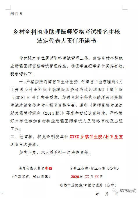 6.報考鄉(xiāng)村全科執(zhí)業(yè)助理醫(yī)師繼續(xù)提供《報考鄉(xiāng)村全科執(zhí)業(yè)助理醫(yī)師資格考試知情同意書》(附件4)、《鄉(xiāng)村全科執(zhí)業(yè)助理醫(yī)師資格考試報名審核法定代表人責(zé)任承諾書》(附件5)