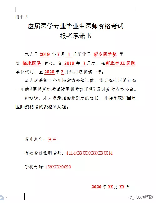 附件3、應(yīng)屆醫(yī)學(xué)專業(yè)畢業(yè)生醫(yī)師資格考試報(bào)考承諾書填寫示例