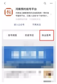 5.網上預約方式:關注微信公眾號“河南預約掛號平臺”點擊“執(zhí)業(yè)醫(yī)考”選擇“考生預約”。具體操作見附件1。