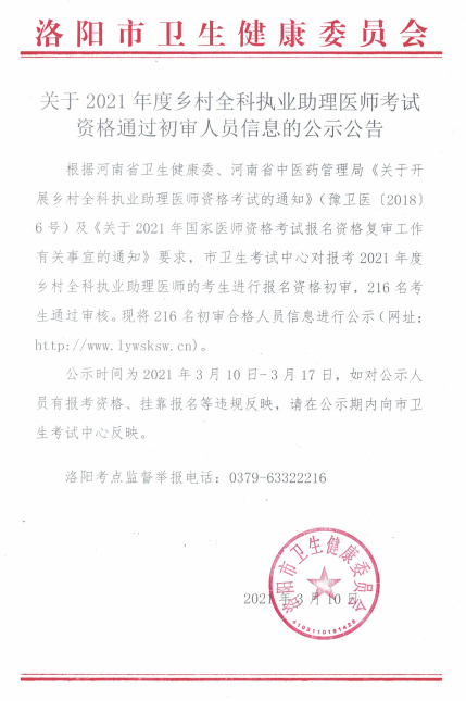 洛陽考點關(guān)于2021年度鄉(xiāng)村全科執(zhí)業(yè)助理醫(yī)師考試資格通過初審人員信息的公示公告