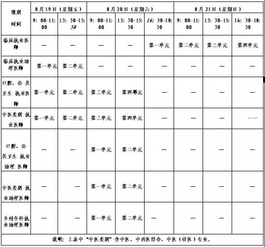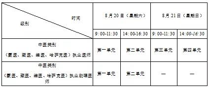 考試實行計算機(jī)化考試,軍隊現(xiàn)役人員加試軍事醫(yī)學(xué)、院前急救崗位和兒科專業(yè)加試相應(yīng)內(nèi)容。中醫(yī)類別蒙醫(yī)、藏醫(yī)、維醫(yī)、哈薩克醫(yī)專業(yè)實行紙筆考試。統(tǒng)一考試時間如下: