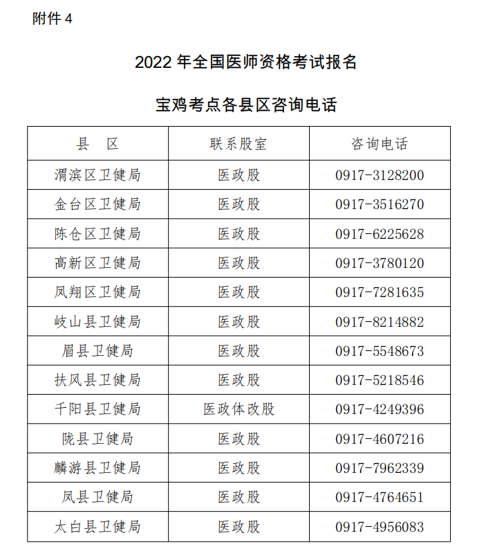2022年全國醫(yī)師資格考試報名陜西省寶雞考點各縣區(qū)咨詢電話