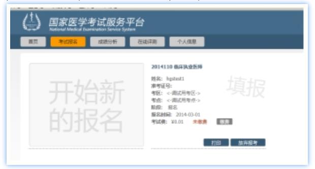 (三)完成繳費(fèi)。考生最終繳費(fèi)成功的標(biāo)志,以國(guó)家醫(yī)學(xué)考試服務(wù)平臺(tái)考生服務(wù)端中的“已繳費(fèi)”為準(zhǔn)。(如下圖)
