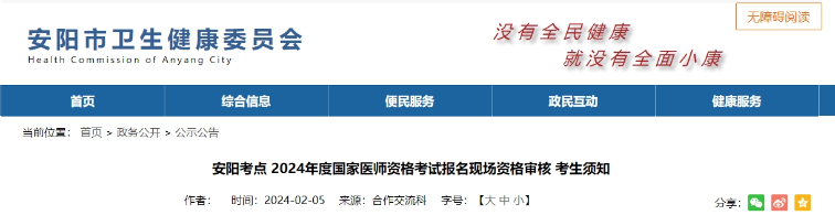 為確保廣大考生順利參加考試,根據(jù)《國(guó)家衛(wèi)生健康委員會(huì)醫(yī)師資格考試委員會(huì)公告》(2024年第2號(hào))要求,結(jié)合我市實(shí)際,現(xiàn)將安陽(yáng)考點(diǎn)2024年醫(yī)師資格考試考生報(bào)名現(xiàn)場(chǎng)資格審核有關(guān)事項(xiàng)明確如下: