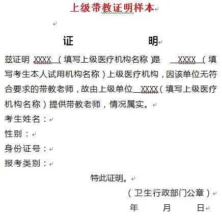 3.村衛(wèi)生室、衛(wèi)生院無(wú)帶教老師的,可由上級(jí)醫(yī)療機(jī)構(gòu)出具帶教老師,須用上級(jí)醫(yī)療機(jī)構(gòu)的帶教老師資格證、執(zhí)業(yè)證復(fù)印件并加蓋公章,考核證明需加蓋上級(jí)機(jī)構(gòu)和本單位公章各一個(gè),并出具醫(yī)聯(lián)體證明,并加蓋衛(wèi)生行政部門公章,無(wú)證明的需填寫《上級(jí)醫(yī)療機(jī)構(gòu)出具帶教老師的證明》(見樣本)加蓋衛(wèi)生行政部門公章。