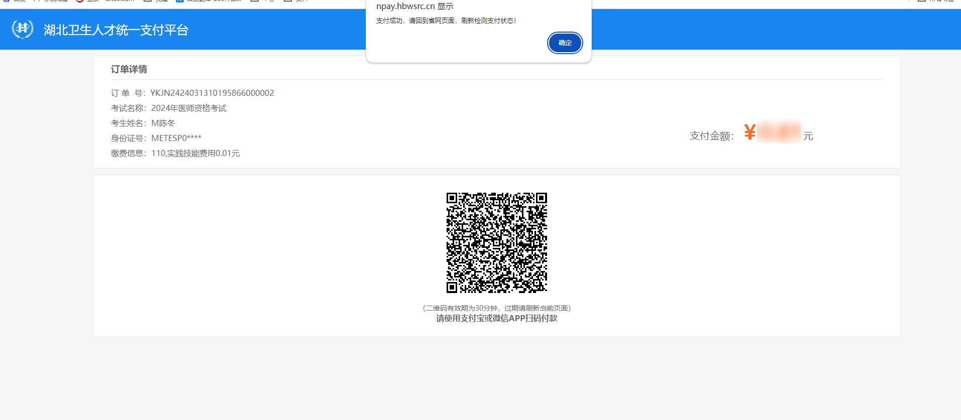 6、支付完成功后可直接關(guān)閉頁面,返回國家醫(yī)學(xué)考試考生服務(wù)系統(tǒng)。
