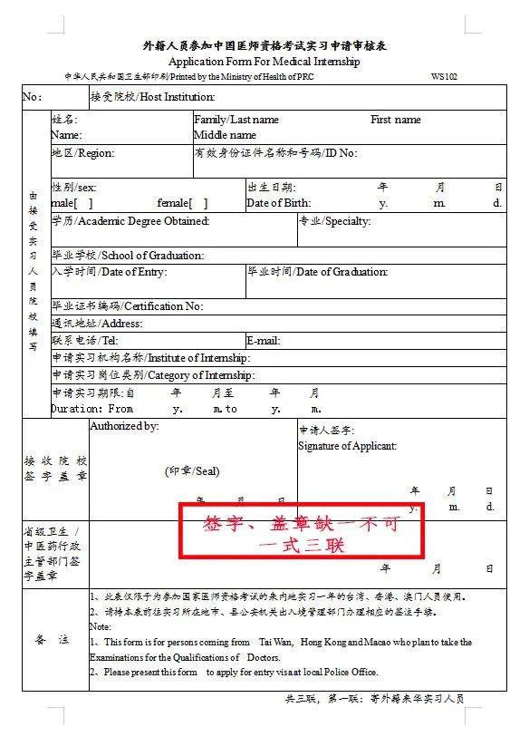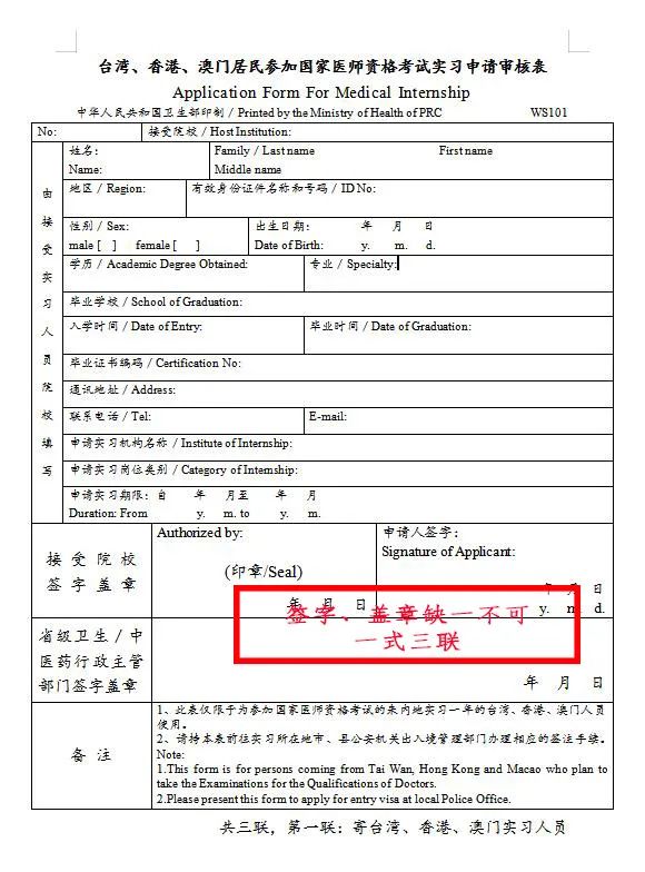 臺(tái)灣、香港、澳門居民參加國家醫(yī)師資格考試須填寫相應(yīng)的實(shí)習(xí)申請(qǐng)審核表樣式