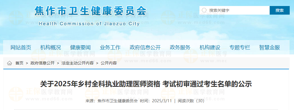 河南焦作市2025年鄉(xiāng)村全科執(zhí)業(yè)助理醫(yī)師資格考試初審?fù)ㄟ^考生名單公示