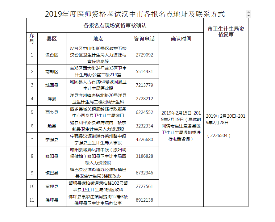 2019年度醫(yī)師資格考試漢中市各報(bào)名點(diǎn)地址及聯(lián)系方式