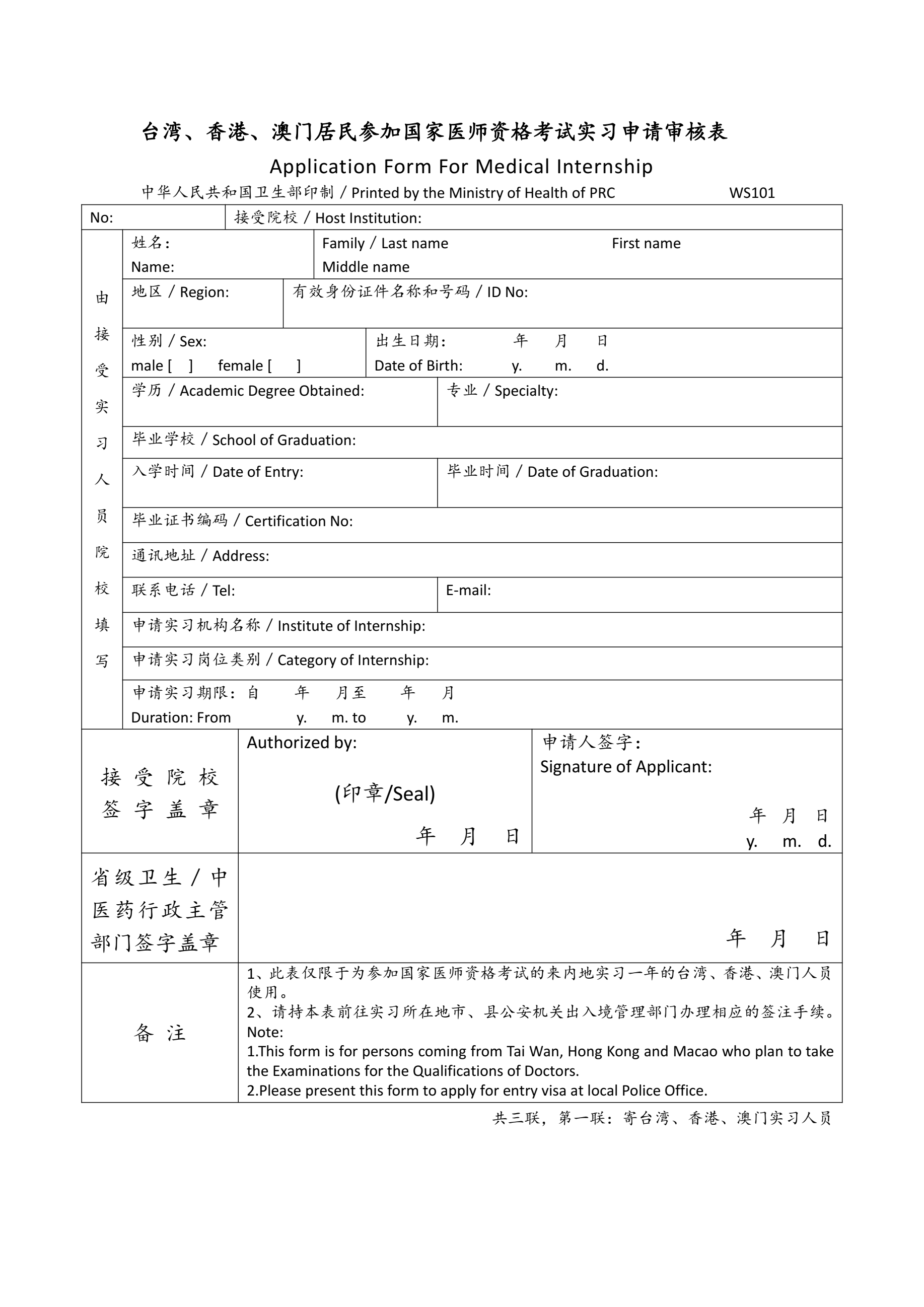【附件下載】臺灣、香港、澳門居民參加國家醫(yī)師資格考試實習申請審核表