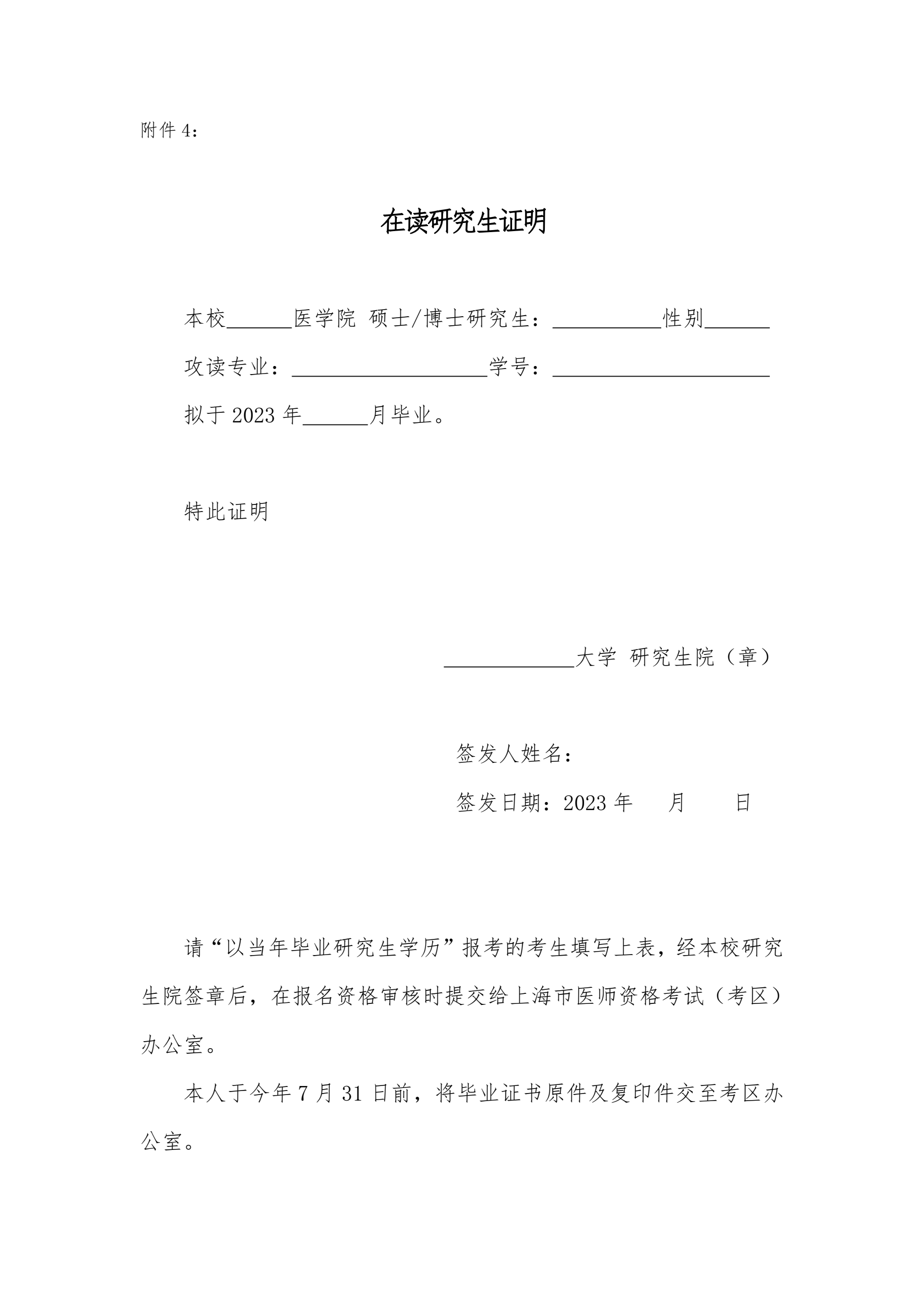 關于“上海市2023年醫(yī)師資格考試報名工作有關事宜的通知”的相關內(nèi)容,醫(yī)學教育網(wǎng)小編專門整理了2023年上海考區(qū)醫(yī)師資格考試報考在讀研究生證明下載word版具體如下: