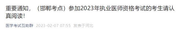 【相關通知】河北邯鄲考點2023醫(yī)師資格考試采取線上審核+現(xiàn)場審核,具體要求速看>