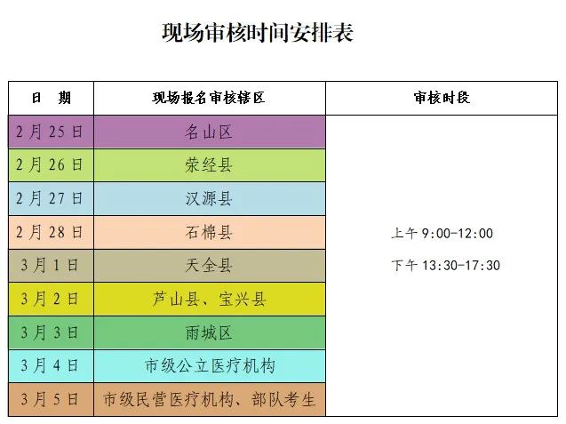 所有考生(包括實(shí)踐技能考試免試考生)均須參加現(xiàn)場(chǎng)審核,現(xiàn)場(chǎng)審核時(shí)間:2月25日——3月5日;審核地點(diǎn):雅安市衛(wèi)生健康與人才服務(wù)中心二樓(雨城區(qū)青衣江路中段62號(hào)),本次現(xiàn)場(chǎng)審核分時(shí)段、分縣(區(qū))進(jìn)行。