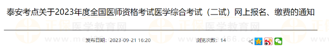 山東泰安考點關(guān)于2023年醫(yī)師資格考試醫(yī)學(xué)綜合考試(二試)網(wǎng)上報名、繳費(fèi)的通知