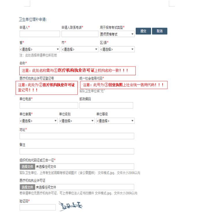 4.進入增補界面后請按照相應欄目要求填寫和提交材料完成增補,醫(yī)療機構(gòu)執(zhí)業(yè)許可證代碼和組織機構(gòu)代碼兩個代碼都要填寫(請認真仔細核對,填寫錯誤將被退回申請),組織機構(gòu)代碼請?zhí)顚憺闋I業(yè)執(zhí)照上的統(tǒng)一社會信用代碼并在“組織機構(gòu)代碼證或三合一證”一欄內(nèi)請上傳營業(yè)執(zhí)照圖片,在“醫(yī)療機構(gòu)執(zhí)業(yè)許可證”一欄內(nèi)上傳醫(yī)療機構(gòu)執(zhí)業(yè)許可證圖片,請考生上傳圖片時認真檢查核對圖片名稱與欄目名稱是否一致,圖片如下: