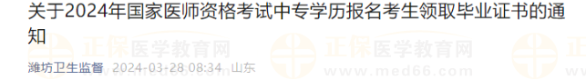山東濰坊考點2024年國家醫(yī)師資格考試中專學歷報名考生領取畢業(yè)證書的通知!請相關考生以通知內(nèi)的方式進行領取!