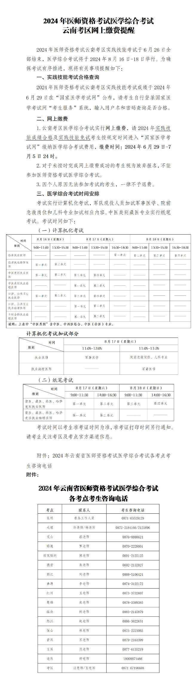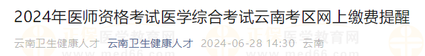 云南考區(qū)2024年醫(yī)師資格考試醫(yī)學(xué)綜合考試網(wǎng)上繳費(fèi)提醒
