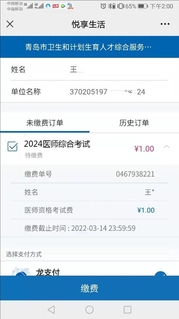 2.青島考點(diǎn)考生繳費(fèi)成功后可在建設(shè)銀行“云平臺”查到繳費(fèi)記錄,國家醫(yī)學(xué)考試網(wǎng)不提供繳費(fèi)查詢服務(wù)。
