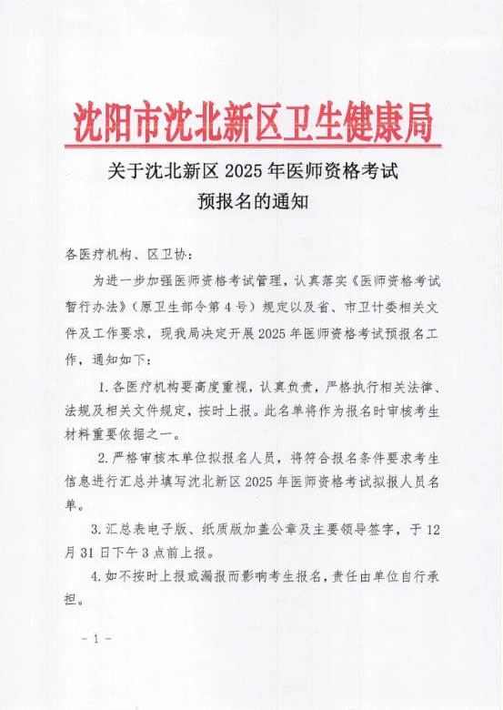 2025年遼寧沈陽(yáng)沈北新區(qū)醫(yī)師資格考試預(yù)報(bào)名工作開始!