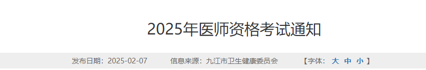 根據(jù)國家衛(wèi)生健康委員會醫(yī)師資格考試委員會公告(2025年第1號)、省衛(wèi)生健康委公告(2025年第1號),中醫(yī)類別執(zhí)業(yè)醫(yī)師、執(zhí)業(yè)助理醫(yī)師資格考試啟用2025年版考試大綱。結(jié)合我市實際,現(xiàn)就江西考區(qū)九江考點2025年醫(yī)師資格考試有關(guān)事項通知如下: