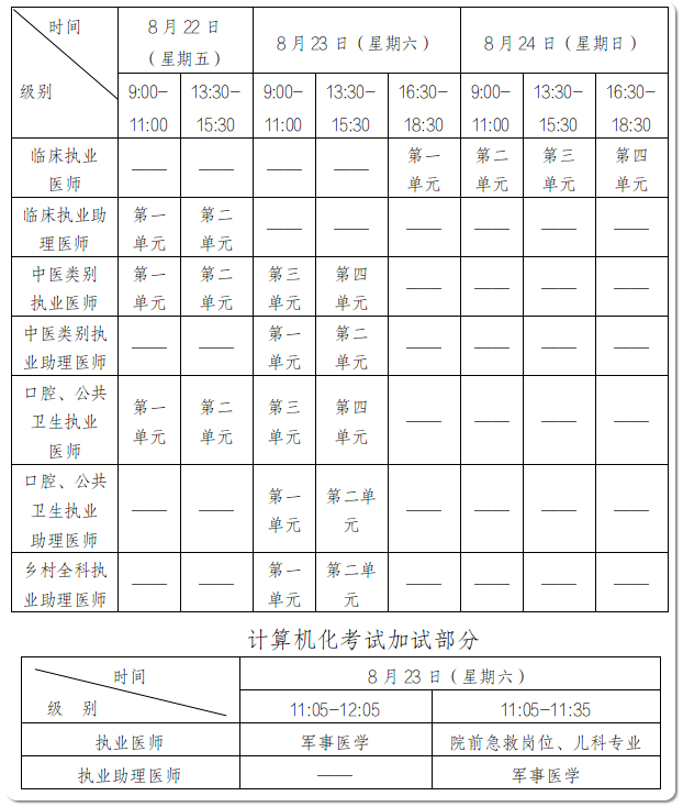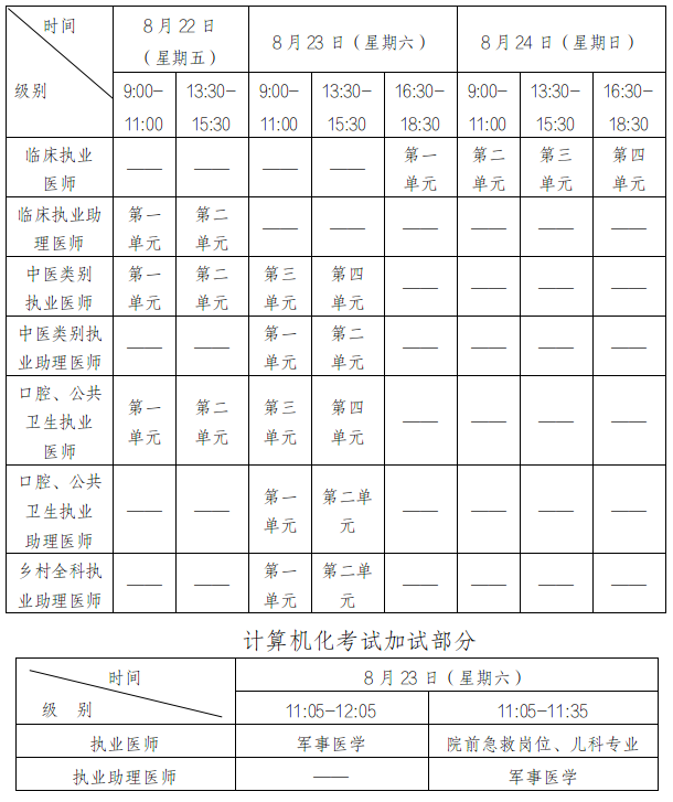考試實行計算機化考試,軍隊現(xiàn)役人員加試軍事醫(yī)學,院前急救崗位和兒科專業(yè)加試相應(yīng)內(nèi)容。執(zhí)業(yè)醫(yī)師合格分數(shù)線為360分,執(zhí)業(yè)助理醫(yī)師合格分數(shù)線為180分。全國統(tǒng)一考試時間如下: ? ?