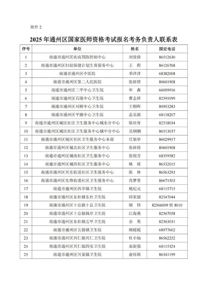 2. 2025年通州區(qū)國家醫(yī)師資格考試報(bào)名考務(wù)負(fù)責(zé)人聯(lián)系表