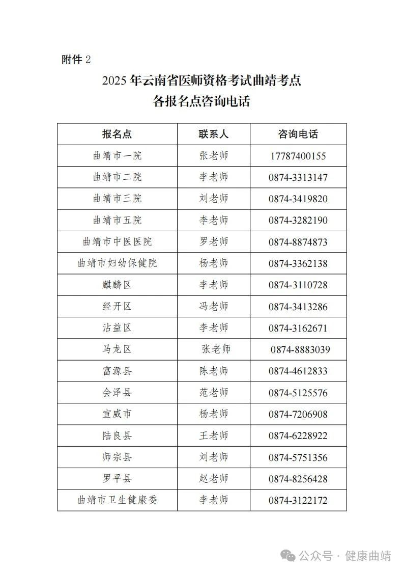 2.2025年云南省醫(yī)師資格考試曲靖考點各報名點咨詢電話