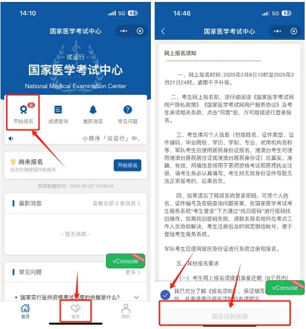 第一步:登陸成功之后可點擊“開始報名”或者直接點擊下方菜單中的“服務(wù)”, 閱讀報名須知并勾選后方可進行下一步報名。