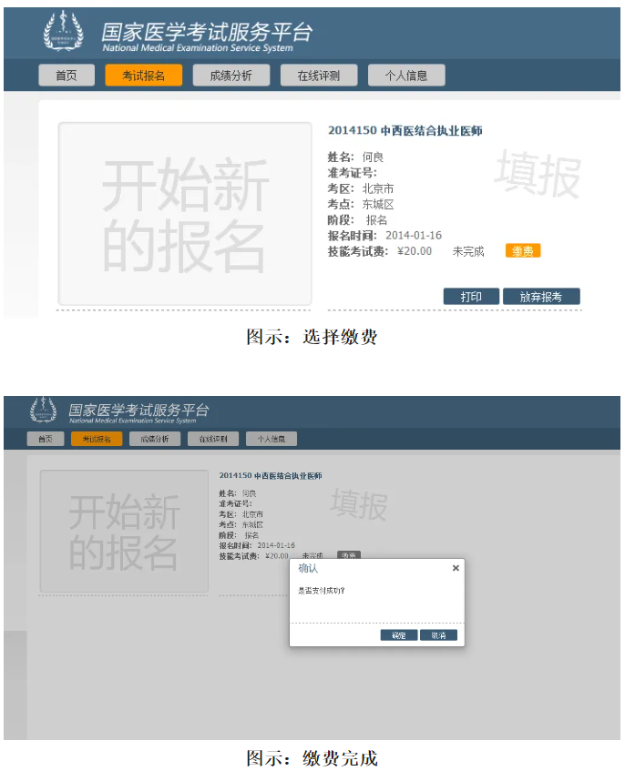 部分考區(qū)在醫(yī)學考試平臺中開設了網(wǎng)上繳費功能,考生可在完成報名信息填報之后,在已報考欄目中