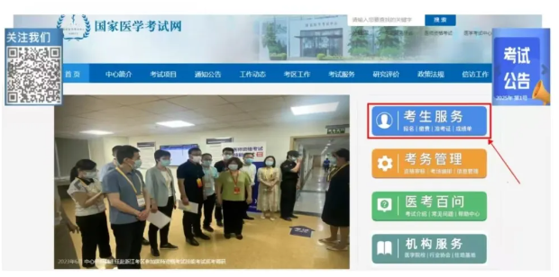 一、登錄國(guó)家醫(yī)學(xué)考試中心官網(wǎng),點(diǎn)擊“考生服務(wù)”。