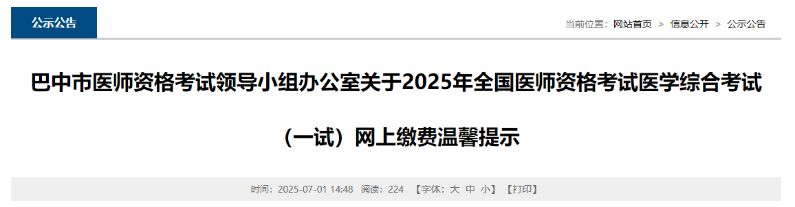 四川巴中2025年醫(yī)師資格綜合筆試繳費7月8日開始,考生注意!