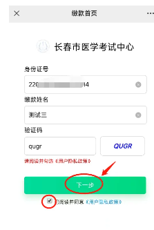 2、輸入身份證號(hào)、姓名、驗(yàn)證碼,勾選下方《用戶隱私政策》,點(diǎn)擊“下一步”。如下圖。他人代繳,請輸入?yún)⒓涌荚嚨目忌救诵畔?/span>
