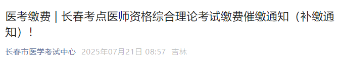 長春考點(diǎn)醫(yī)師資格綜合理論考試?yán)U費(fèi)催繳通知(補(bǔ)繳通知)!