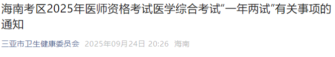 海南省2025年醫(yī)師資格“一年兩試”報(bào)名繳費(fèi)已開始,速看報(bào)名流程!以下為海南省官方通知,請(qǐng)相關(guān)考生及時(shí)查看,做好報(bào)名繳費(fèi)準(zhǔn)備。