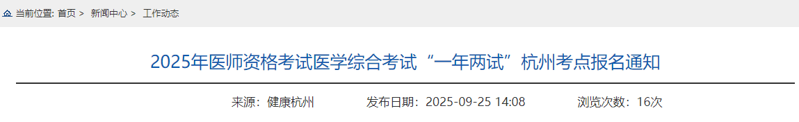 根據(jù)浙江省醫(yī)師資格考試領(lǐng)導(dǎo)小組辦公室《關(guān)于開展2025年醫(yī)師資格考試醫(yī)學(xué)綜合考試“一年兩試”工作的通知》的規(guī)定,杭州考點將繼續(xù)參加2025年醫(yī)師資格考試醫(yī)學(xué)綜合考試“一年兩試”工作。現(xiàn)就有關(guān)事項通知如下: