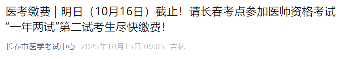 官方提醒!吉林長春2025年醫(yī)師資格(二試)繳費10月16日截止!