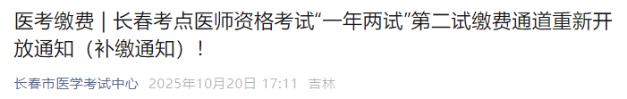 長春考點醫(yī)師資格考試“一年兩試”第二試繳費通道重新開放通知(補繳通知)!
