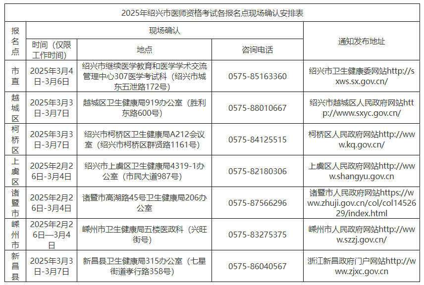 2026年紹興市醫(yī)師資格考試各報(bào)名點(diǎn)現(xiàn)場(chǎng)確認(rèn)安排表