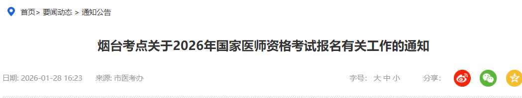 根據《國家衛(wèi)生健康委員會醫(yī)師資格考試委員會公告》(2026年第1號)和山東考區(qū)有關工作安排,現將2026年國家醫(yī)師資格考試煙臺考點報名工作有關事項公告如下: