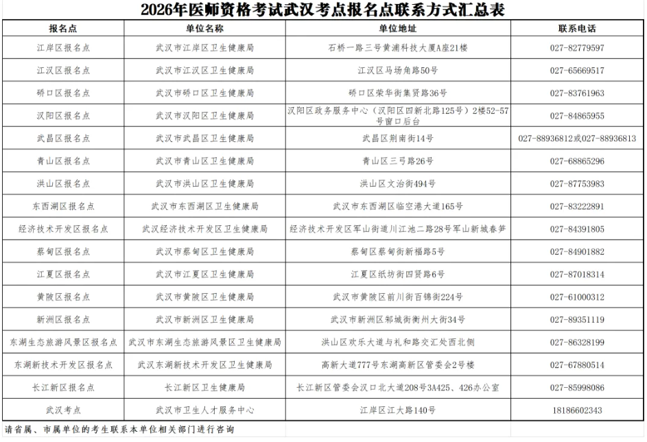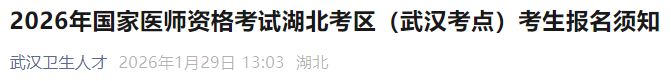 根據(jù)《中華人民共和國醫(yī)師法》、《醫(yī)師資格考試暫行辦法》規(guī)定和《國家衛(wèi)生健康委員會(huì)醫(yī)師資格考試委員會(huì)公告》(2026年第1號(hào))精神,結(jié)合湖北考區(qū)武漢考點(diǎn)實(shí)際,現(xiàn)將2026年國家醫(yī)師資格考試有關(guān)事項(xiàng)通知如下:
