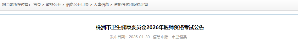 (一)報名參加2026年醫(yī)師資格考試的考生,均須關(guān)注“湖南省衛(wèi)生健康委醫(yī)學(xué)考試中心”微信公眾號以及“株洲衛(wèi)健”微信公眾號,及時獲取考試相關(guān)信息。