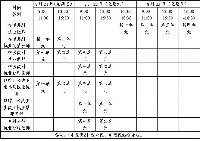 醫(yī)學(xué)綜合考試均為計算機化考試,軍隊現(xiàn)役人員、文職人員加試軍事醫(yī)學(xué),院前急救崗位和兒科專業(yè)加試相應(yīng)內(nèi)容。統(tǒng)一考試時間如下:
