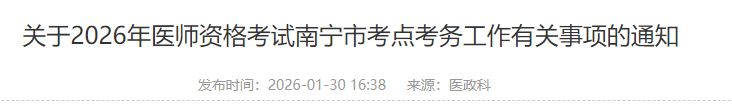 根據(jù)廣西壯族自治區(qū)衛(wèi)生健康委員會(huì)公告(2026年第3號(hào))有關(guān)內(nèi)容,為做好2026年醫(yī)師資格考試南寧市考點(diǎn)考務(wù)工作,現(xiàn)將有關(guān)事項(xiàng)通知如下:
