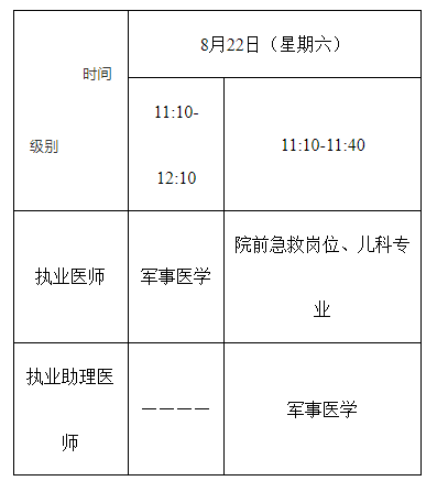 醫(yī)學綜合考試(一試)由資陽考點承擔(包括所有類別,即臨床執(zhí)業(yè)醫(yī)師、臨床執(zhí)業(yè)助理醫(yī)師、中醫(yī)類別執(zhí)業(yè)醫(yī)師、中醫(yī)類別執(zhí)業(yè)助理醫(yī)師、口腔執(zhí)業(yè)醫(yī)師、口腔執(zhí)業(yè)助理醫(yī)師、公共衛(wèi)生執(zhí)業(yè)醫(yī)師、公共衛(wèi)生執(zhí)業(yè)助理醫(yī)師、鄉(xiāng)村全科執(zhí)業(yè)助理醫(yī)師)。時間安排如下: