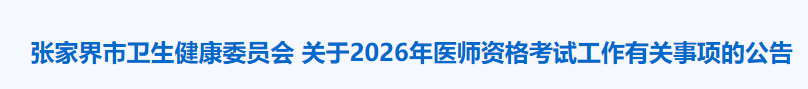 根據(jù)《國家衛(wèi)生健康委員會醫(yī)師資格考試委員會公告》(2026年第1號)和《湖南省衛(wèi)生健康委員會公告》(2026 年第1號)要求,現(xiàn)就張家界市2026 年醫(yī)師資格考試工作有關(guān)事項公告如下: