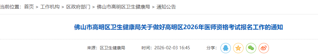 (3)我局根據(jù)上級主管部門文件和要求整理制定了《佛山市高明區(qū)2026年醫(yī)師資格考試報名相關要求》(附件1)供各單位的考生閱讀并指導考生按照要求報名。