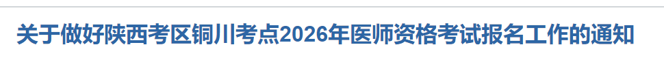 按照國家衛(wèi)生健康委醫(yī)師資格考試委員會(huì)《公告》(2026年第1號(hào))和陜西省衛(wèi)生健康委醫(yī)師資格考試領(lǐng)導(dǎo)小組辦公室公告要求,現(xiàn)就2026年醫(yī)師資格考試陜西考區(qū)銅川考點(diǎn)報(bào)名和資格審核有關(guān)事項(xiàng)通知如下: