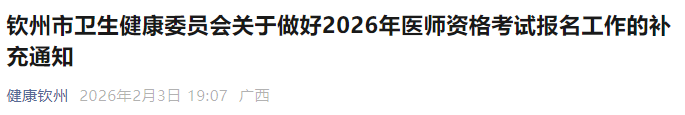 廣西欽州2026年醫(yī)師資格考試報(bào)名&現(xiàn)場審核安排及注意事項(xiàng)已公布!請相關(guān)考生及時(shí)查看,做好報(bào)名審核準(zhǔn)備!